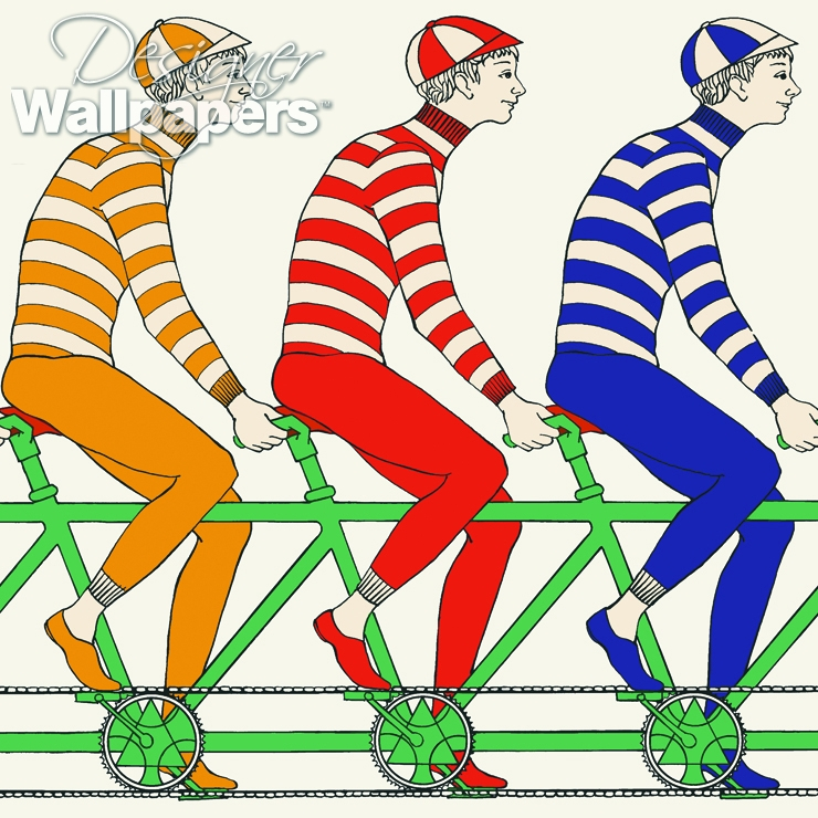 Both Piero Fornsasetti and his son, Barnaba, have been cycling enthusiasts from an early age. Here the humble bicycle has re-appeared as a fun 52cm high frieze. Multiplette features nine cyclists pedalling along on a multi-saddled bicycle in ‘comic-strip’ striped jerseys and caps. Produced in bright and nostalgic colours, this frieze measures 52cm high and is sold on a 7.5m roll comprising 5 complete bicycles.